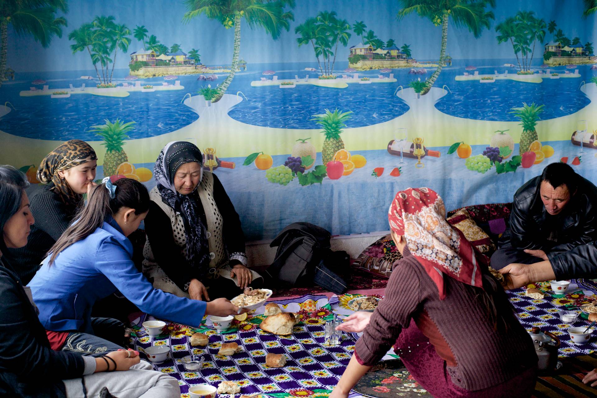 By early afternoon we reach Karakul, a stunningly blue and turquoise lake rimmed with white salt deposits and patches of green pasture. The wind has picked up and we seek shelter in one of the roadside restaurants. It is warm inside. A yak dung fire burns in the stove. We eat mutton and noodles in front of a wall-paper that shows fancy villas on tiny tropical islands, palm trees, deck chairs, lavish fruit and bottled wine.