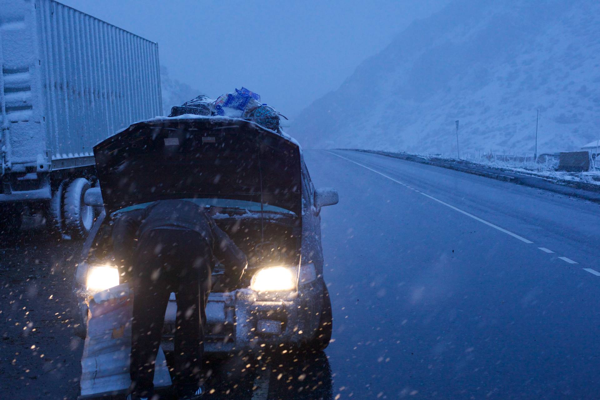 Once we have passed both checkpoints (and repaired a flat tire on the way) it is getting dark and the road is covered in snow. Our driver is worried. We are approaching the final pass behind Sary Tash. The tires barely have enough grip. Silence in the car, night outside. Wayfaring along the Pamir Highway has made us companions in fate.